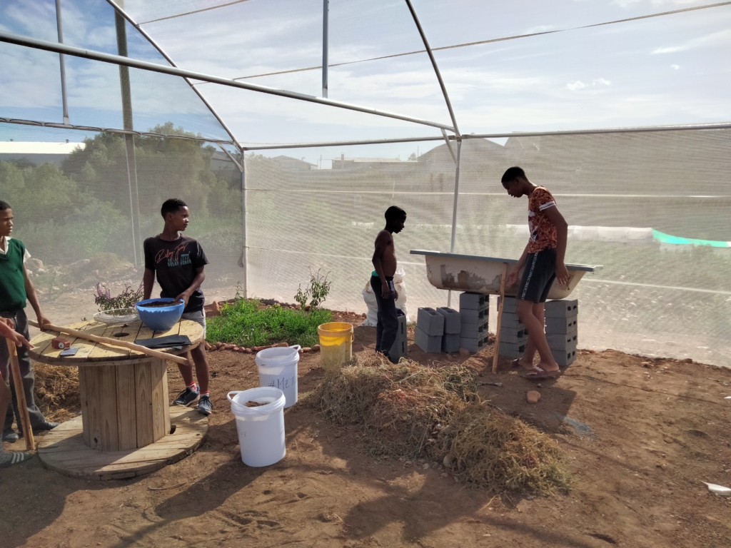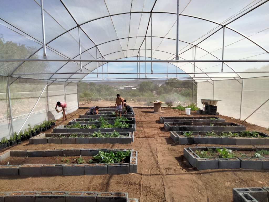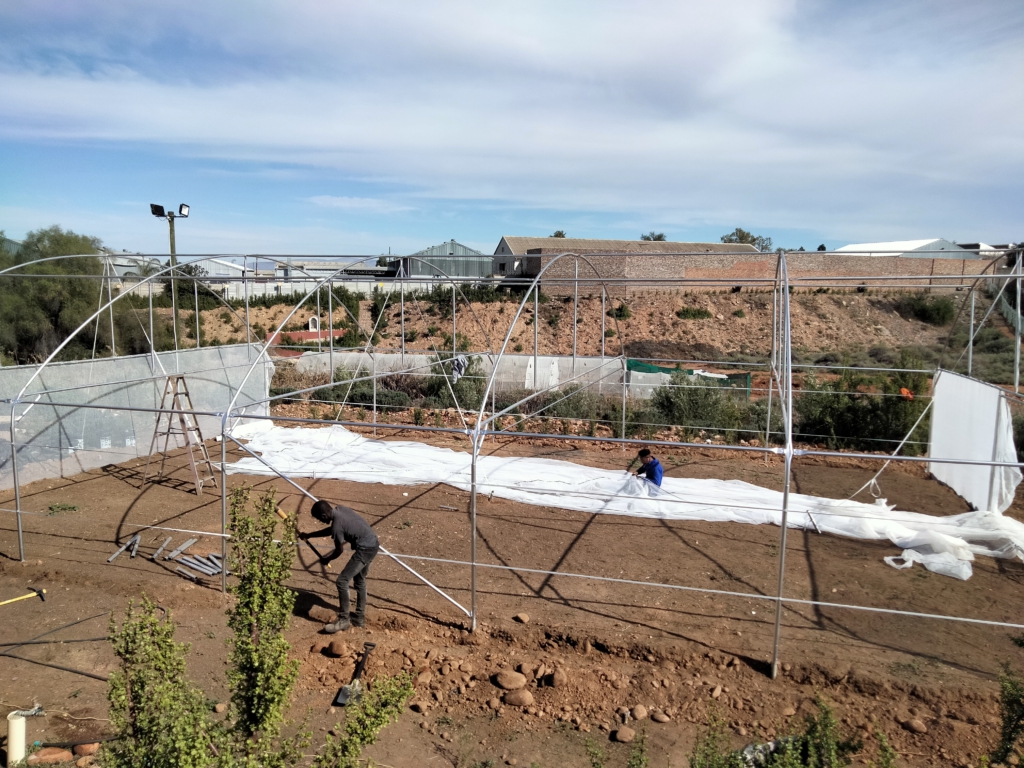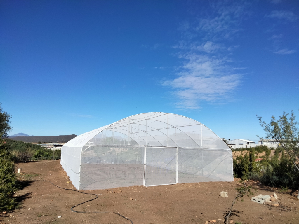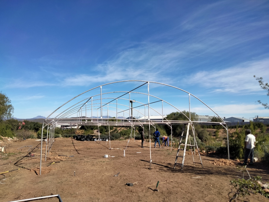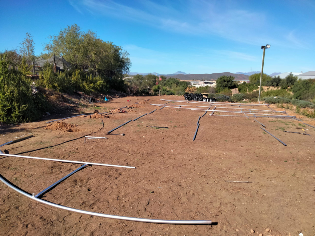 Aufgrund des rauen Halbwüstenklimas und der anhaltenden Auswirkungen des Klimawandels ist es auch unserer Erfahrung nach sehr schwierig geworden, Gemüse im Freien anzubauen. Als erstes kauften wir daher einen Folientunnel/Gewächshaus, um einen nutzbaren Raum für den Gemüseanbau zu schaffen. Nach einigen Verzögerungen (auch aufgrund der Covid-Pandemie) traf der Folientunnel aus Johannesburg ein und wurde aufgebaut. Die nächste große Herausforderung bestand darin, den Boden vorzubereiten. Vor dem Erwerb dieses Grundstücks im Jahr 2006 wurde es viele Jahre lang als informelle Mülldeponie genutzt und die nahegelegenen Fabriken füllten in dieses kleine Tal ihren Müll. Große Teile unserer Böden sind eigentlich nichts weiter als alte Mülldeponien und es bleibt eine große Herausforderung, sie wieder fruchtbar zu machen.